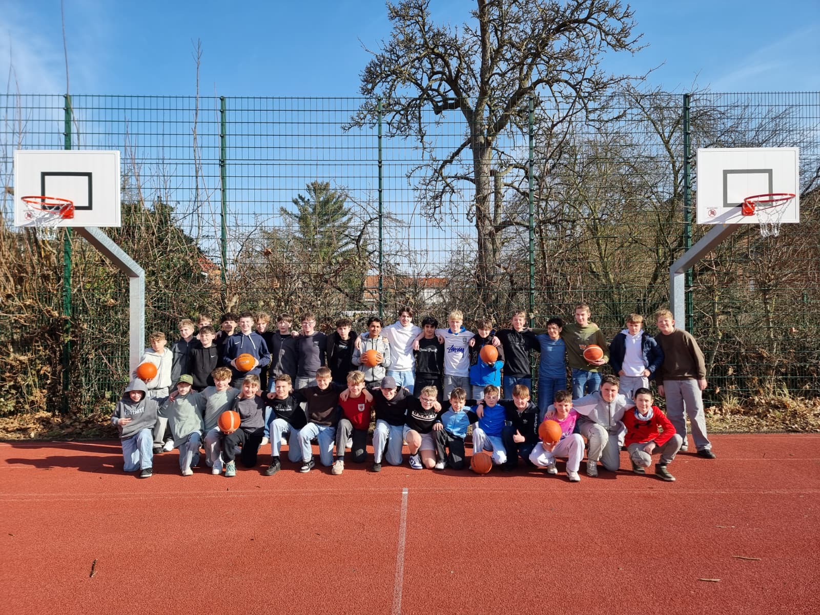 Pünktlich mit den ersten warmen Tagen des Jahres ist unsere Schule um eine sportliche Attraktion reicher: Auf dem Schulgelände wurden zwei neue Basketballkörbe installiert. Die moderne Anlage erweitert nun das Bewegungsangebot in den Pausen und im Sportunterricht.